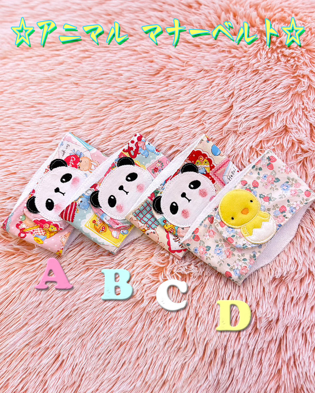 ☆アニマル マナーパンツ☆J&Kanimalsから、男の子用のマナーベルトの登場です~♪表地は、イチゴ柄とレトロアニマル柄の2種類の布地にパンダとヒヨコのアップリケをつけました=*^-^*=裏地には防水加工のパイル布を使用しました♪見せパンツにしてもオシャレです~男の子には必須アイテムなので何枚あっても良いですヨ(*゜▽゜*)上からcolor:A・B・C・D3S/¥2860(税抜¥2600)ウエスト19cm~23cmSS/¥2970(税抜¥2700)ウエスト23cm~28cmS/¥3080(税抜¥2800)ウエスト30cm~35cmmaterial:綿100%