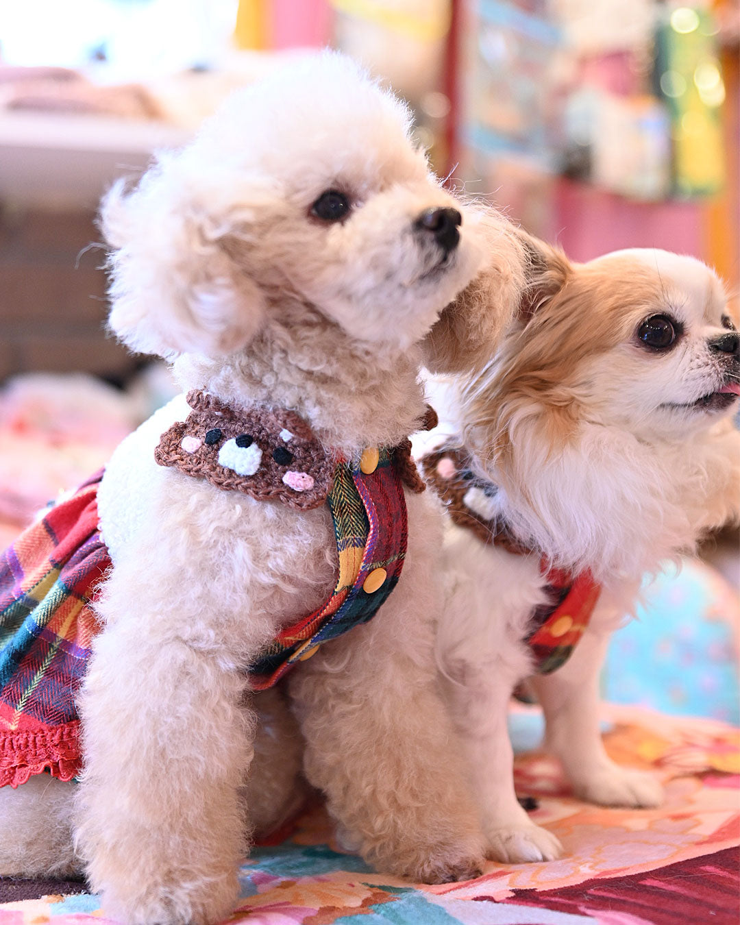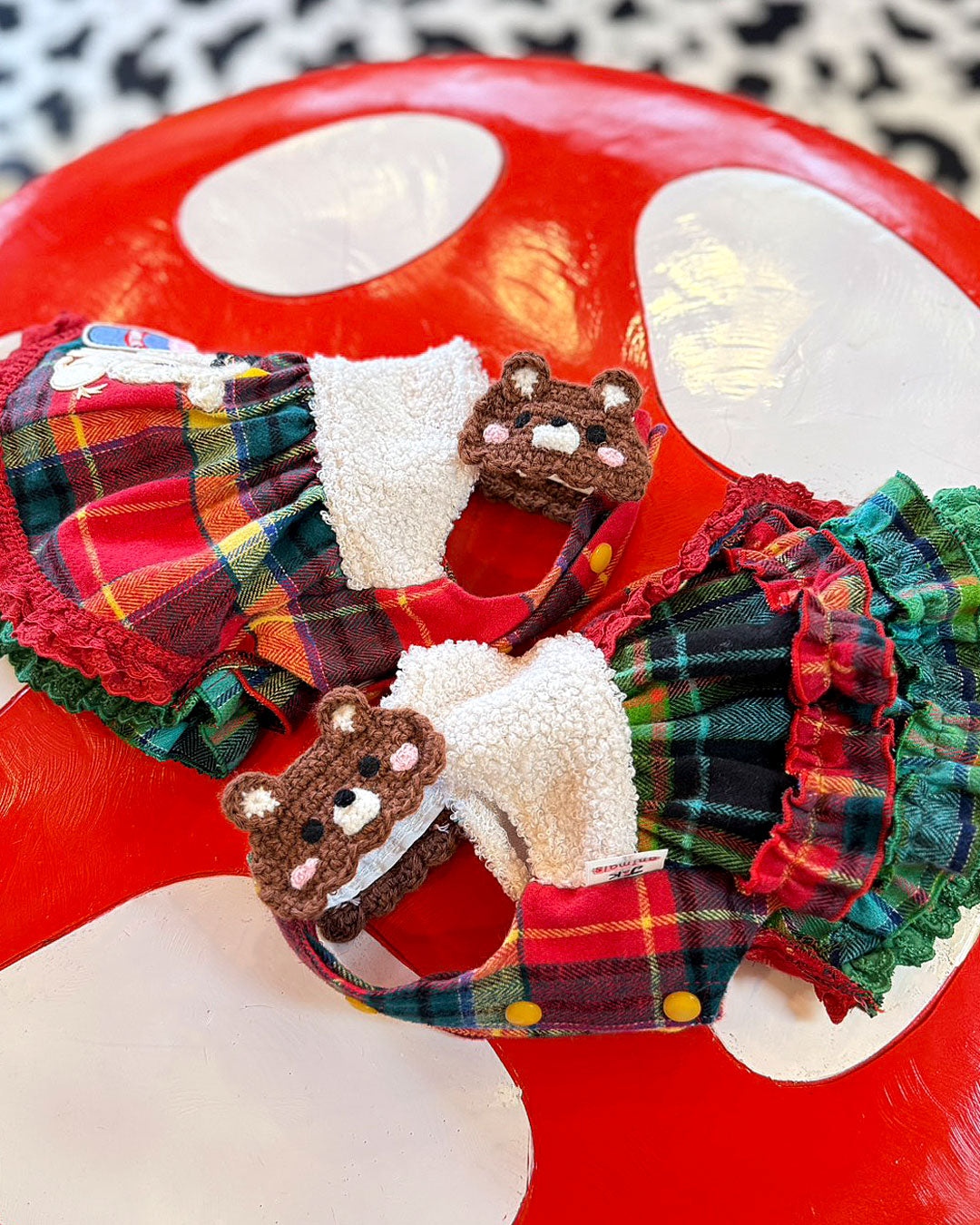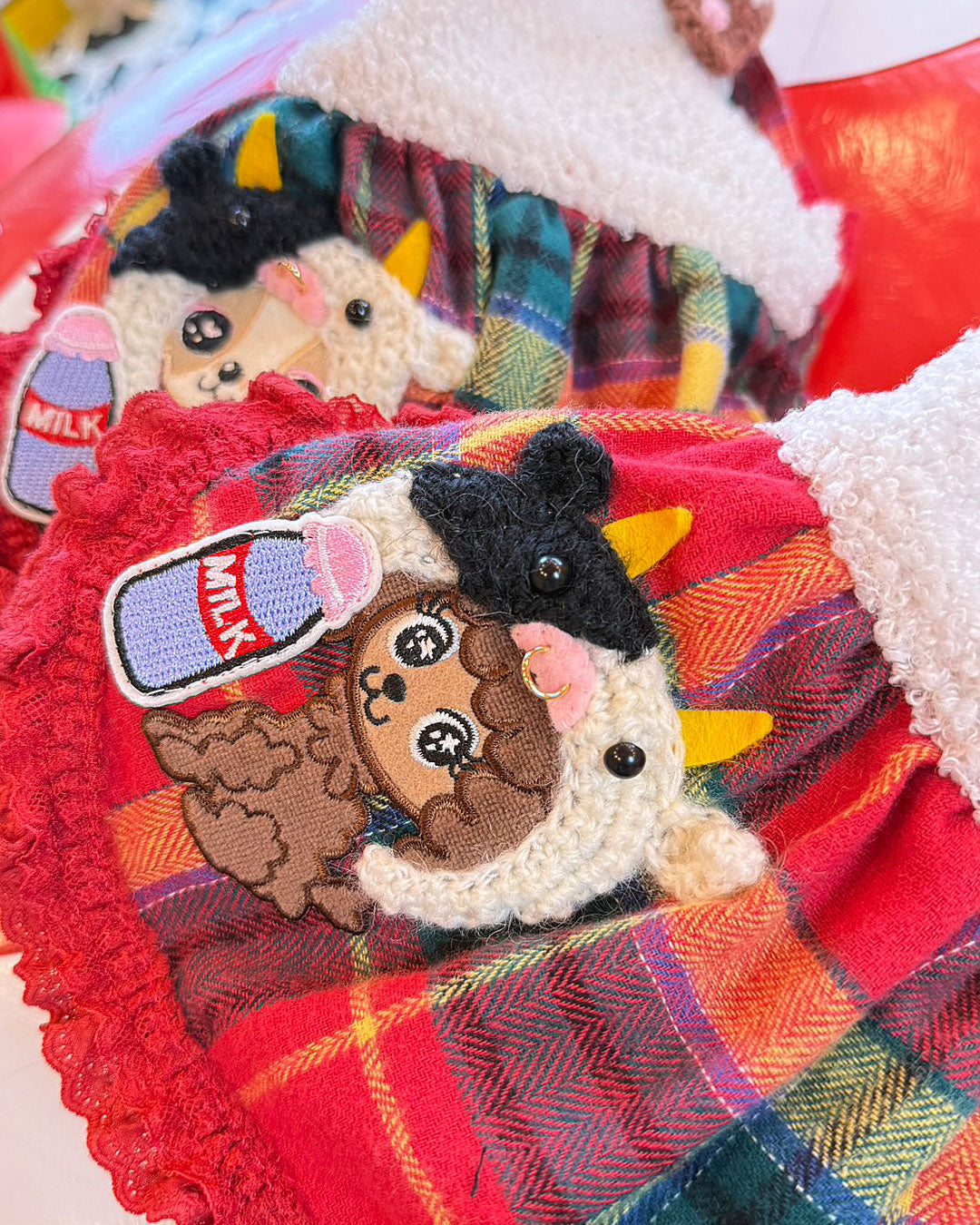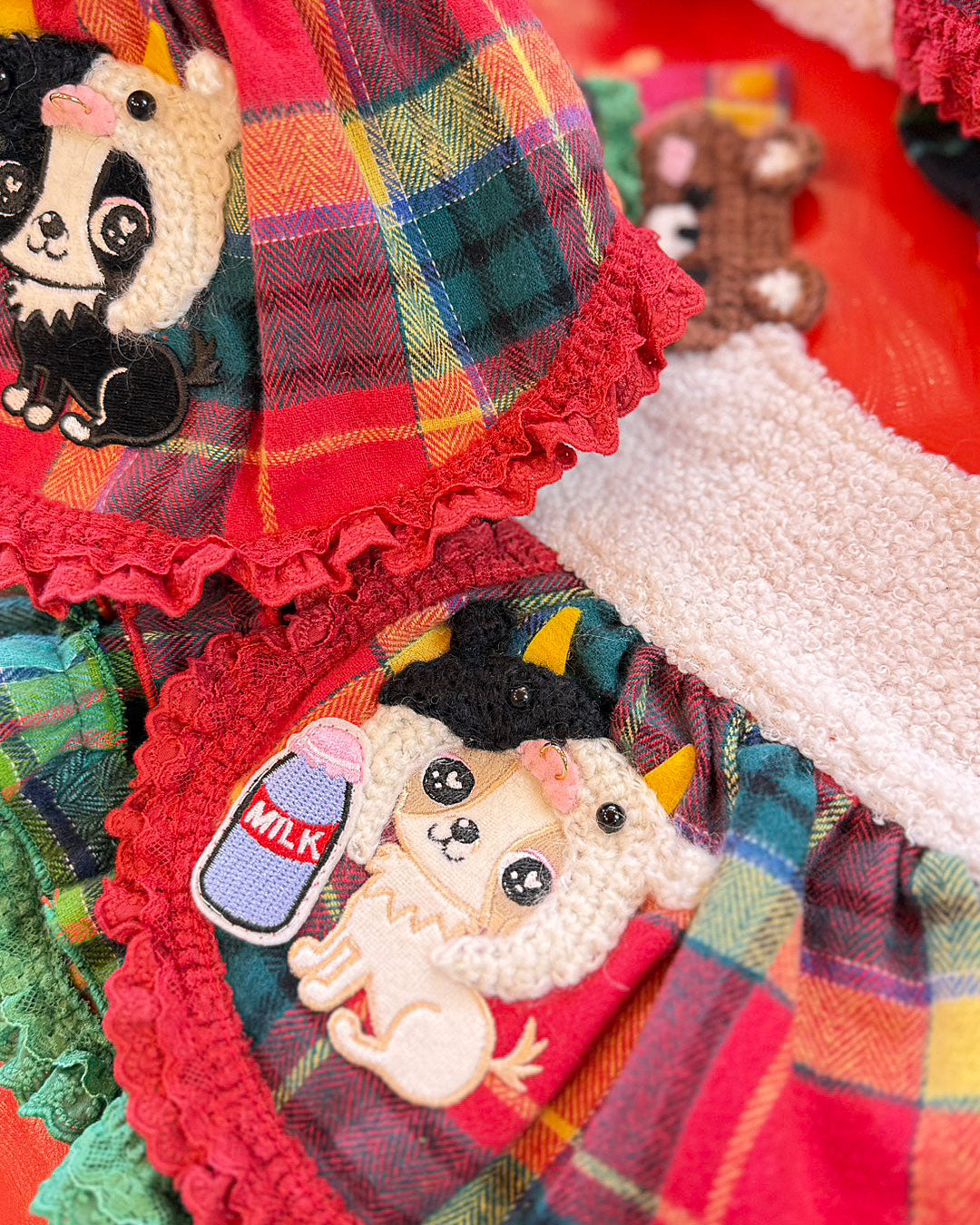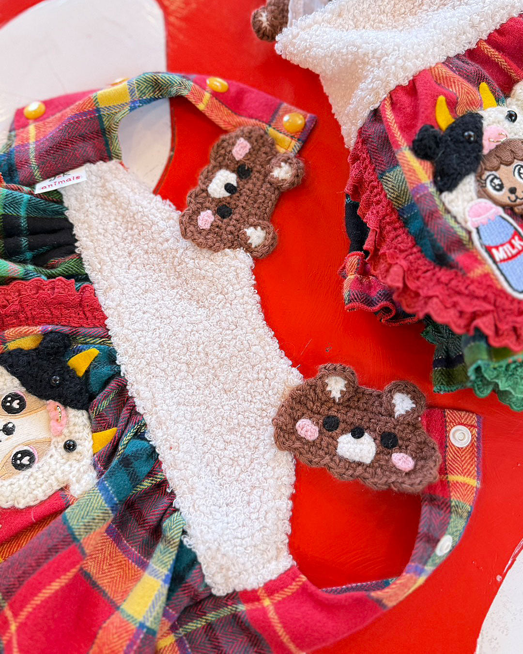 ☆モーモーくまさん ワンピース☆J&Kanimalsから、とびっきりキュートなワンピースが登場です~♪赤×緑のタータンチェックのスカートにレースフリルをあしらい、ガーリーに仕上げました。さらに、J&Kオリジナルキャラクターをプラス(^^♪キャラクターには、1点1点手編みの“うしさん帽子”をかぶせて、ミルクを持たせています♪上身頃には、モコモコのファー素材を使用し=^-^=お肩には、くまさんの編みモチーフをつけて可愛いポイントにしました\(^_^)/スカートはアシンメトリーでボリューム感のあるデザイン。とってもオシャレな仕上がりのワンピースです♪前あきタイプでお袖がないデザインなので、限定商品らしく細部までこだわった作りになっています??これからのイベントシーズンにも大活躍まちがいなしです~(゜▽゜)キャラクター:はるちゃん・こなつちゃん・シュガーちゃん/ブラウン・シュガーちゃん/ピンクColor from left:Haru / Konatsu / Sugar-Brown/ Sugar-Pink4S:4S-L¥10780(税抜¥9800)3S:3S-L¥11000(税抜¥10000)SS:SS-L¥11220(税抜¥10200)S:S-L¥11440(税抜¥10400)material:コットン100%